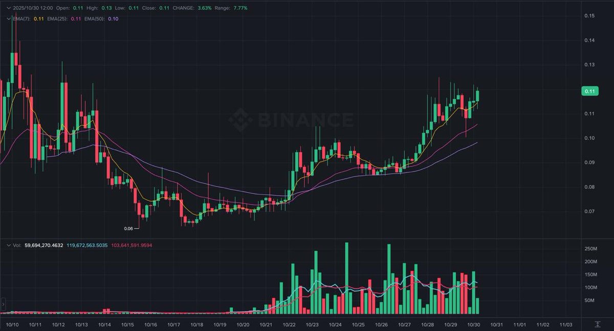 交易量稳定在 5 亿美金上下,底部从 0.065 拉到 0.115,涨了近 80%,多头趋势孕育中。