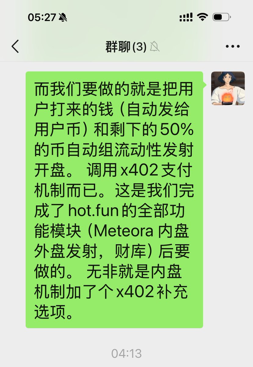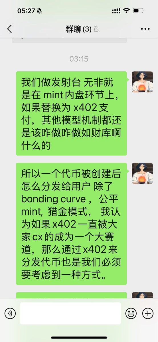 正如我所建议,把facilitator design in x402作为前置层,实现meme币的初始公平mint分发,然后再结合如fourmeme等Launchpad平台实现全自动的流程发射代币,正如$PENG的诞生过程友情,实现全自动化去。这样就帮助目前的Launchpad前置接入了最先进最公平的分发方式。 在这个全自动流的过程里,可以收取一点费用是很合理的。 希望可以和我们即将在10天左右发布的创新发射台@402dotfun合作,我们想要打破fourmeme的垄断地位,给BNBCHAIN和行业带来创新,才会有进步。