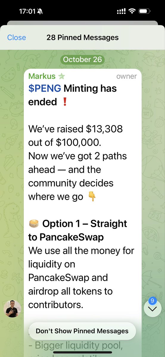 以下是摘取PENG的TG群里的置顶信息,基本上解释清楚了整个的创建过程。 $PENG Minting has ended ❗️ We’ve raised $13,308 out of $100,000. Now we’ve got 2 paths ahead — and the community decides where we go 👇 🥞 Option 1 – Straight to PancakeSwap We use all the money for liquidity on PancakeSwap and airdrop all tokens to contributors. Pros: - Bigger liquidity pool, price less volatile Cons: - Since we raised only $13K, some people might get big supply and could move the price. - No four meme visibility — we’ll be on our own. 4️⃣ Option 2 – 4Meme + 10k Buyback Dev Buy 13.3% of the total supply and airdrop those tokens to contributors. $10k from the raised funds will be used to buy back and burn tokens in the first 4 hours of the launch. Pros: - Big exposure on 4Meme = more eyes, more hype, more buyers. - Fairer distribution, smaller allocations, no whales manipulating the chart. - Dev buy and burn adds credibility and volume. Cons: - Smaller liquidity pool, price more volatile. The $PENG community has spoken ❗️ We’ll move forward with launching on 4Meme for maximum exposure and fairer distribution. Now we just need to decide the launch time ⏰ Please choose your preferred launch slot: - Around 17:30 UTC (around 2 hours) This is EU and US friendly - Around 11:30 UTC (tomorrow) This is EU and Asia/China friendly ETA is around 1 hour. Most of the bags are 0.2%-0.3%, just a few addresses will get over 0.5%, so we should have a good distribution. Since people know that we are launching there will be probably snipers. If you want to buy more try to be early, otherwise wait for snipers to dump. WIll airdrop your supply immediately after bonding (before token is not transferable, but we should bond quite fast). If someone FUD on X/TG about that is because they don't know that we did a raise, so explain and help clear. AIRDROP SENT https://t.co/1eOpCzi5fC