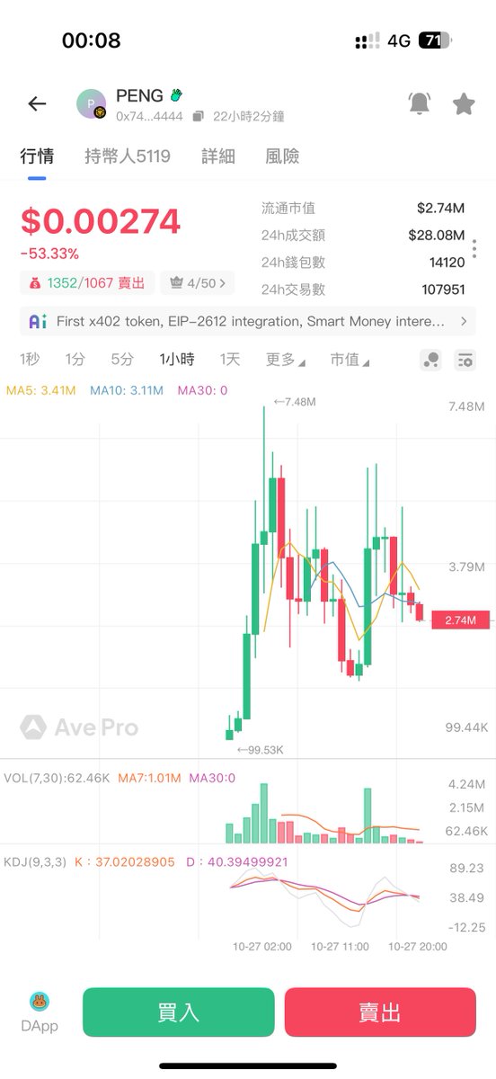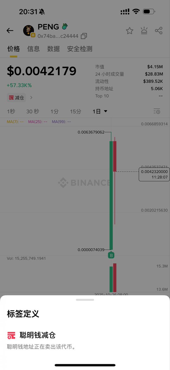 bsc @BNBCHAIN 上第一個 x402 協議代幣 $PENG ,熊貓@Cryptopanda1418 發群裡大概是 400k 左右,目前已翻倍,項目方設置了每三分鐘自動銷燬機制,感覺還是有點意思。 CA: 0x74ba6142b659edd2521164fecc92ab733fc24444 24✘掃鏈打狗: