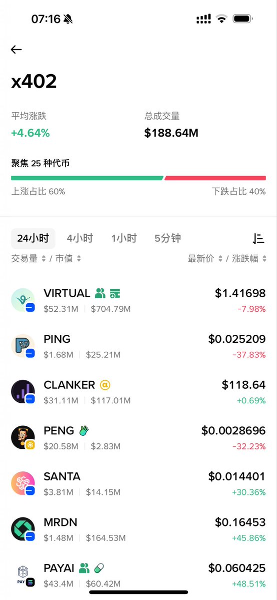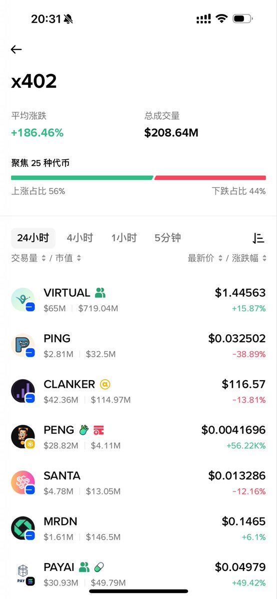 橙子晚间解读 10.27 x402真的让我想起了当年ai agents 热潮,要不是 $trump 发币把这版块吸死了,想必也会出来几个大蓝筹吧,这波x402算是对ai agents 行情的延续,并且统一了iq50和iq100玩家的审美! 媳妇终于熬成婆了,周末几乎全是好消息啊!首先是周五老美的CPI数据,不管是广义还是核心CPI全线低于预期,这种数据免不了要被maga一顿吹嘘,新任美联储主席哈赛特表示数据出色,通胀正在放缓,大总管贝森特表示川普上台后通知一直在降。另外白宫表示下个月不会发布通胀数据,这意味着这份好数据能够坚持俩月,现在市场已经完全定价接下来的两次降息了;第二个好消息是中美贸易谈判非常顺利,双方几倍达成共识了,美国取消100%的关税,中国推迟稀土管制一年,并且采购美国大豆双方共同打击芬太尼供应,这次的谈判结果是双方在官媒上确认过的,人民日报甚至用了共同维护好来之不易的中美经贸磋商结果这种表述,看起来大家都很满意,这也意味着周四韩国的会晤双方大佬就签个字握个手走个形式就好了,然后川普今天下午还表示明年年初会访问中国,总之贸易战风险是解除了,很多避险资金又要进场了,这是周末反弹的主因。 整个周末社区都非常热闹,主要原因就是x402协议,可能你会纳闷x402 不就出来个 $ping 吗,涨到最高也才80m的fdv,其它的几个同赛道meme交易量也币bsc的中文meme小很多,为啥社区反应反而比中文meme更强烈,尤其是X上,x402的帖子都快刷屏了,搞技术的、搞金融的、搞社区的必须人手一篇自己对x402的理解,之所以中文meme甚至之前p小将时代社区不热闹,是因为iq50和iq100的玩家始终无法达成共识,很多币圈老韭菜早起都是敲代码的或者科技从业者,后面进入币市的也大多有金融从业或者交易经验,经历过几个牛市而没有被市场洗出去的老韭菜基本都有一套相对成熟的投研体系,而正是这种在一级和二级市场厮杀出的经验,让这类人几乎完全踏空几轮meme和中文meme阶段,简单说就是看不懂,觉得市场在博傻,不愿涉嫌进入长期必然归零的赛道去赚取短期收益,这种火中取栗的行为对于经历过多轮牛熊的老韭菜来说性价比是很低的,而事实上也确实如此,这几轮meme行情几乎只有车头或者攒局的一小撮人赚钱了,盲目进场被收割的概率挺大,甚至你都不确定你买的meme背后是不是缅北园区发出来的,这就是所谓的IQ100不接盘现象,而meme的主要玩家其实都是iq50选手,他们经验少、本金少,来币市就是为了以小博大,进来就是pvp找速通,高周转,做得好的确实也赚钱,但大部分其实成为meme时代的燃料喂饱了车头和发币者。 而这波x402和之前的纯meme或者中文meme不同的是,它统一了iq50和100的审美,比如ping在p小将眼里确实就是meme或者铭文,而在老韭菜眼里这代表未来的通用技术,未来可能衍生出类似支付宝这样的顶级巨头,所以两种类型的投资者都会选择去买入持有,而且x402还有个好处就是它并不是一个复杂的技术,用facilitator一个词机会就能表示,并且很容易让大家带入未来在ai agents时代的作用,x402出身可能比当年的铭文更具正统性,当时铭文被比特币核心开发者认为是垃圾交易和bug的场景还历历在目,而这波x402背后是cb、ETH基金会、google,技术门槛低,资源门槛高,也就是说失败不是很容易,未来可能像中国移动一样靠拍照躺赚,另外铭文当时延伸到其他智能合约公链时,确实有技术倒退的滑稽,好像5g手机强行把大家拉回2g时代发文字一样,x402不存在这个问题,这是效率至上,天下武功唯快不破,所以x402的可扩展性更强,现在bsc、base、sol都在蹭蹭的往外冒,且你都无法预测龙头会诞生在哪里,周末之前ping还被认为是绝对龙头,周一已经跌了3x了,sol 链的 $payai 成为新的龙一,现在 $eigen $bnkr 已经加入x402赛道了,后面龙头很难说是谁,也正是这种群龙无首的状态是那大结果最好得机会,只要你压中了龙头或者前几个项目,回报都是非常巨大的,可能之前炒作的ai agents 又要重新出来溜一圈,当时这个赛道可以有几个接近百亿的龙头啊,放在现在不敢想象,本轮出现几个1b以上的,早起买入的几乎都得赚翻。 另外本轮最大受益者可能就是x402发射台了,可能ping 走了一波过山车行情,但是 $virtual 实打实的相比周五翻倍了,$clanker 相比周五翻了接近5x,而且今天也没咋回调,这说明市场对x402赛道的预期是非常高的,所以还在躺平的兄弟可以动动了,今天p出来的 $x402 $peng $u402 等等都是几m的市值,现在资金都非常饥渴,正经团队做的项目成功的概率是非常高的,走势可以参考上轮 ai agents 行情。