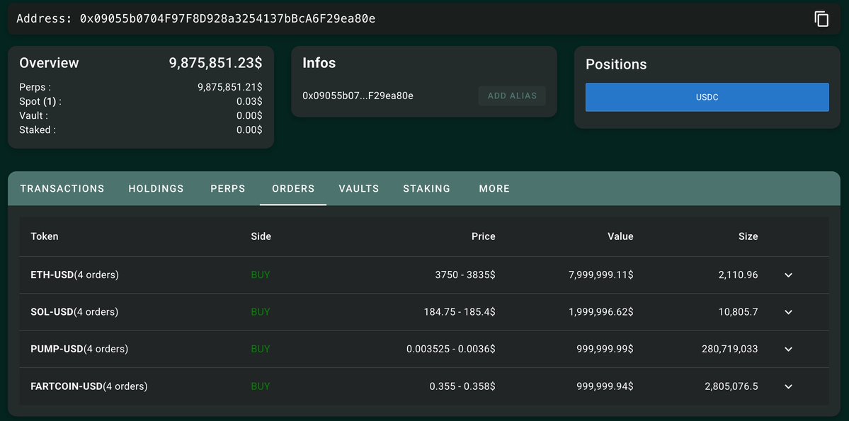 地址 0x090...ea80e 在 10 小时前大盘下跌趋势中向 Hyperliquid 充值了 988 万枚 USDC,随后和 CBB 一样挂了四个代币的限价买单,只是价格相对没有那么激进,要是被他俩接到,市场又要血流成河了🥹