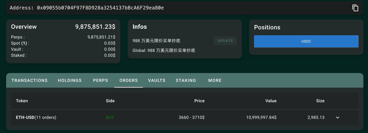打开一看,嘿,今天凌晨下跌时他重新调整了价格范围,最新的 ETH 抄底预期为 [$3660 - $3710],该点位计划买入 1100 万刀,比原有挂单价格又低了 100 刀…🥹
