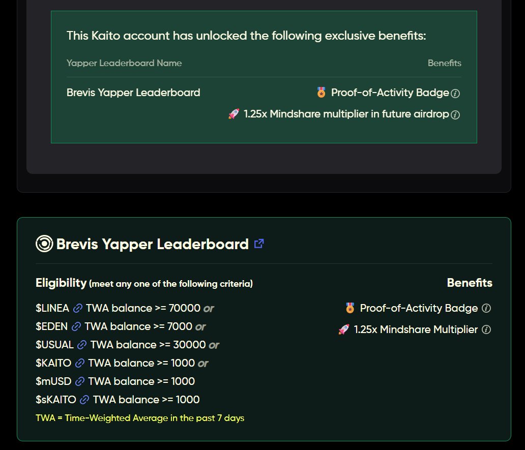 Kaito 纯嘴撸的时代快要过去了。 Brevis 打响了改革的第一枪,链上交互将成为重点。 要想获得进入 @brevis_zk Kaito Yapper 排行榜的资格,需要满足项目方制定的规则条件。 而 Brevis Yapper 排行榜的第 2 阶段的条件是钱包持有以下资产: $LINEA ≥ 70000 $EDEN ≥ 7000 $USUAL ≥ 30000 $KAITO ≥ 1000 $sKAITO ≥ 1000 $mUSD ≥ 1000 而且数据获取是用了 Brevis 的零知识证明: 用户无需暴露个人的钱包信息就能证明自己的链上数据。 此外,通过证明的用户能解锁 1.25 倍的 Mindshare 乘数,会更容易进入排行榜前列。 这种与项目产生深度交互、与用户链上行为关联的模式已经开始兴起了。 InfoFi 模式的出现,让创作者能够写文变现,也因此产生了信息泛滥等问题。 而加上链上行为活动的考量提升了门槛,不仅能减少内容泛滥,也能筛选出项目真正的忠实支持者。 看好这种模式,看好 @brevis_zk 将 ZK 证明在 InfoFi 中广泛应用。