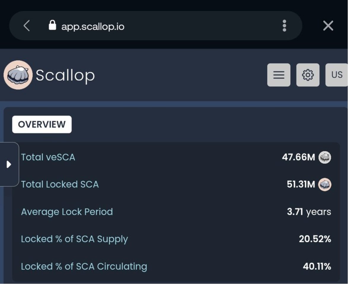 SCA 总流通供应量的 40% 以上现已锁定在 Scallop 上,平均锁仓期限长达3.71年,最高可以锁4年,这反映了Scallop 社区的信任、信心和长期承诺。