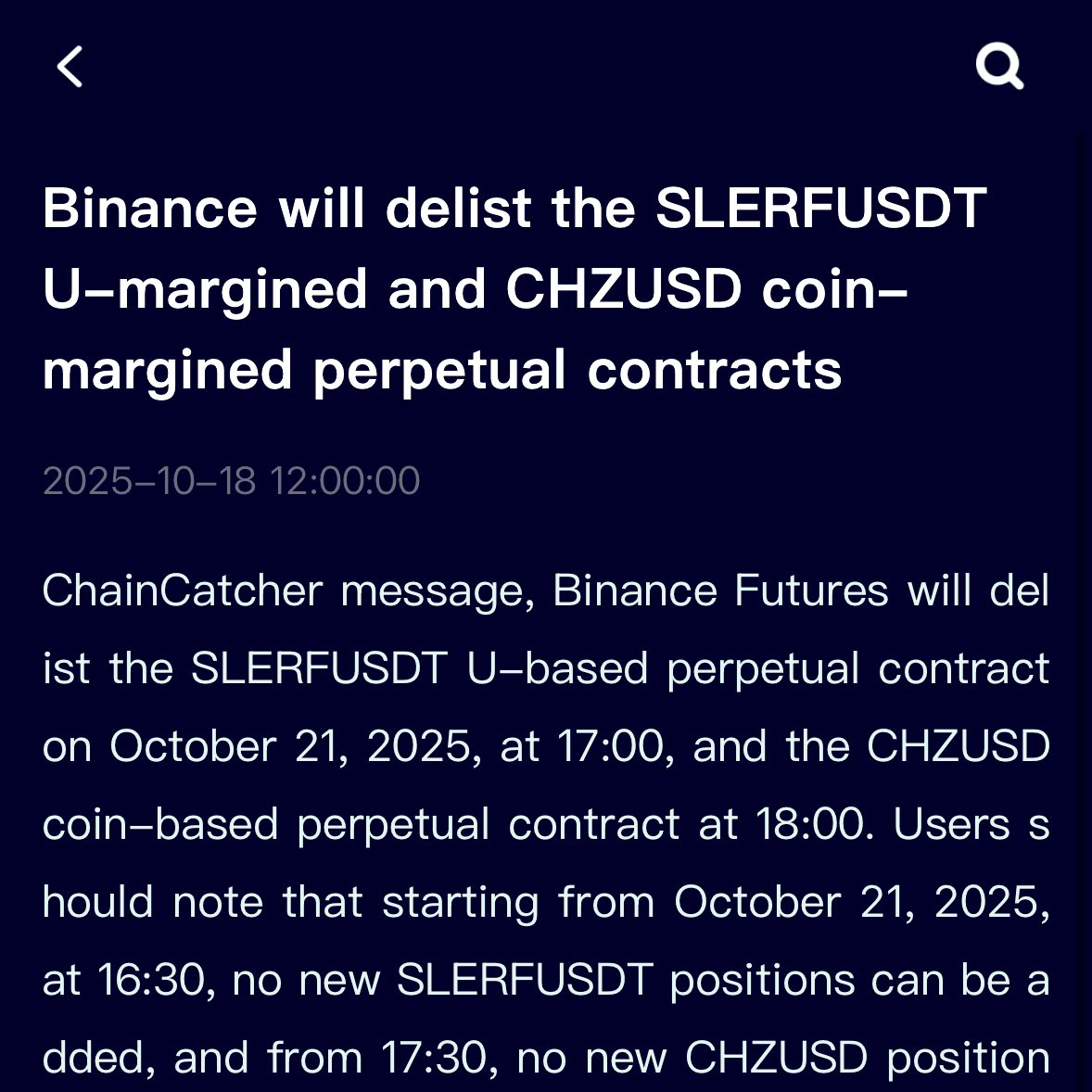 🔵 币安下架 $SLERFUSDT U 本位和 $CHZUSD 币本位永续合约