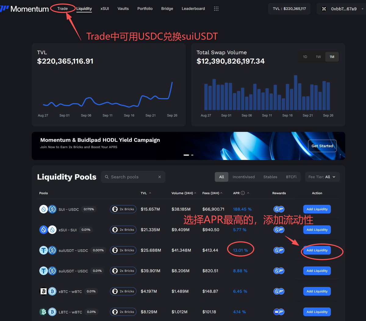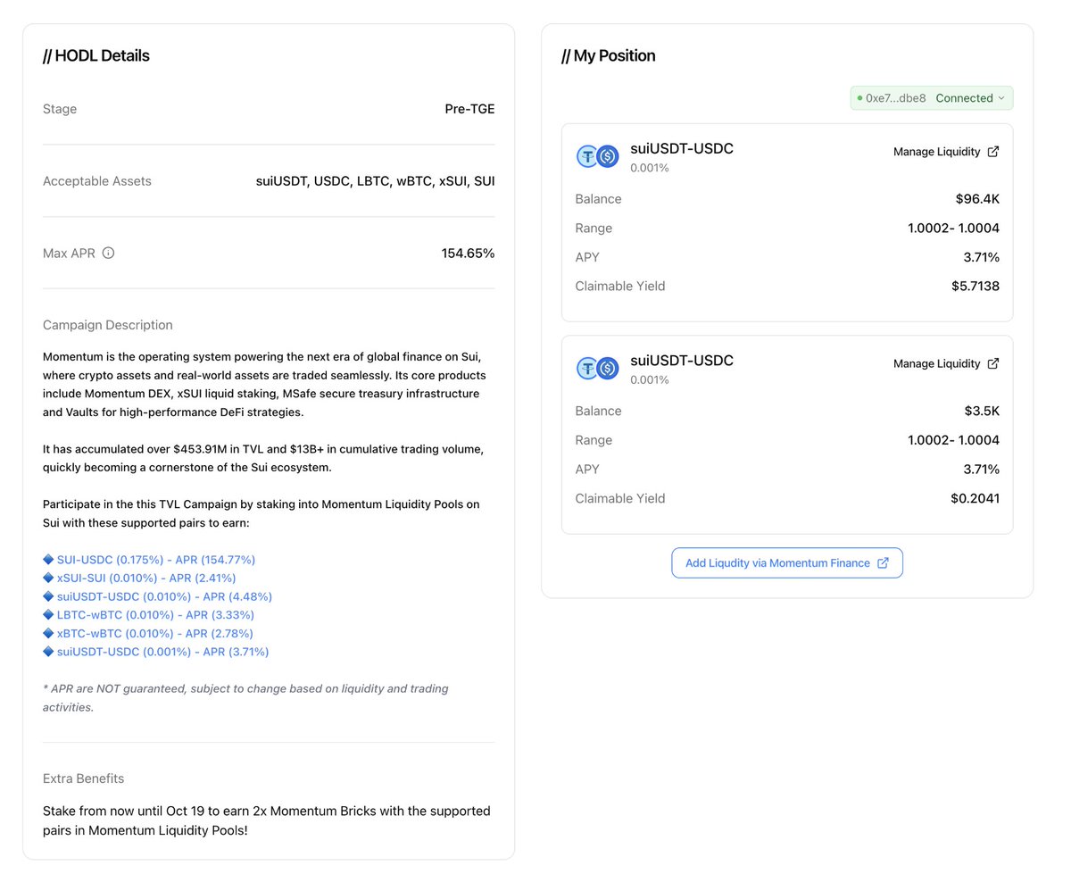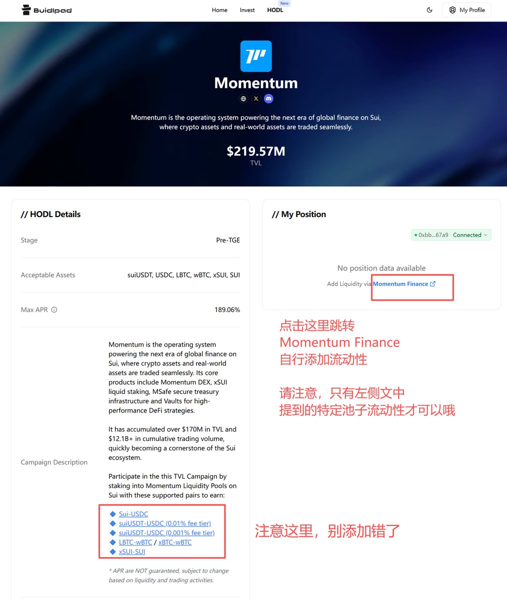 一定要在Buidlpad上绑定您用于Momentum质押的钱包以获取资格,否则白搭,不放心可直接通过Buidlpad HODL界面添加LP;