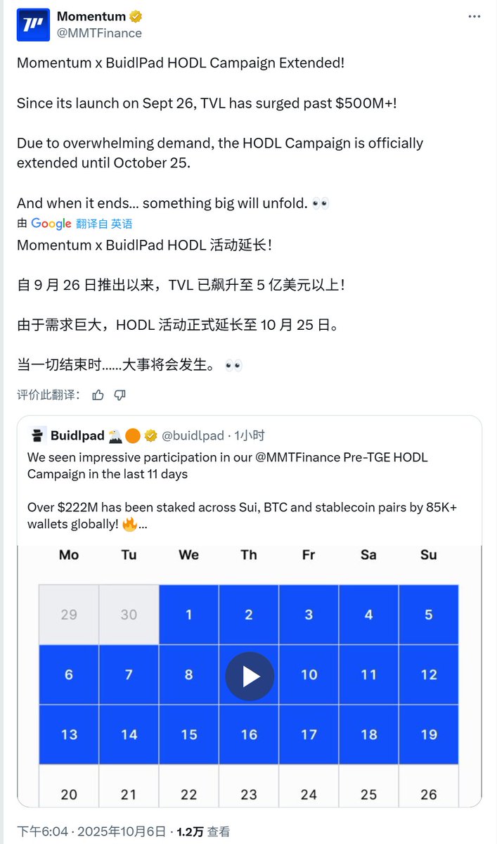 杰尼获悉:Momentum @MMTFinance 表示将Buidlpad @buidlpad HODL活动延长至10月25日,关键在于,一切结束时,大事将会发生。