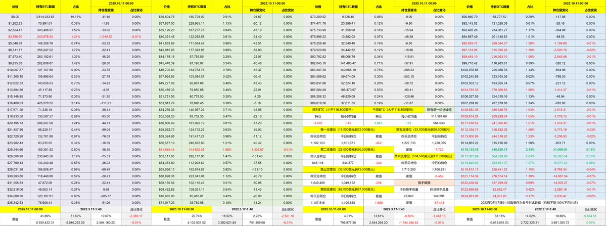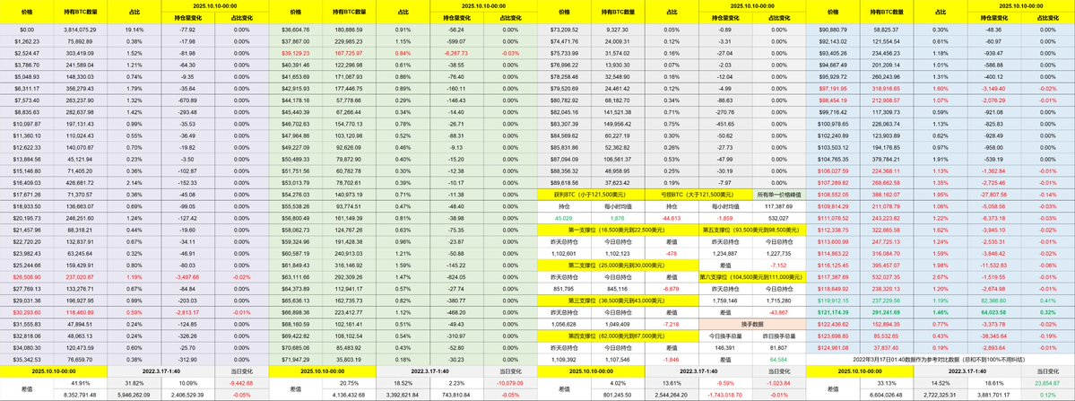 一个不小心天都亮了,今天的市场并没有太大的变动,该停摆的继续停摆,该吵架的继续吵架,美国虽然小幅下调,但幅度并不是很大,而加密货币市场的波动稍微大了一些,不知道和最近48小时的 Meme 行情有没有关系,身在局中才体验到了用户 FOMO 的情绪,不断的会有人传销你什么是好的,角度在哪里,未来多么的辉煌。 有那么一瞬间我都想多加仓了,我也听说有小伙伴上头后卖出了自己的部分仓位在Meme中博弈,这个市场就是一个人性的放大器,如果控制不住自己的情绪赚了在多钱都有可能凭本事输回去,专注自己专业且熟悉的赛道,努力让自己活的更久可能会更重要一些。 今天 $BNB 跌的比 $BTC 和 $ETH 都大,不知道是不是在市场中赚钱的小伙伴直接 U 本位退出了,而其它加密货币资产贬值的更大,这种情况在当初 $Trump 的时候也见过,在铭文的时候也见过。 回到 Bitcoin 的数据来看,换手率稍微有些增加,但还是在合理的范围之内,主要换手提供的仍然是短期投资者,但从美股的结构来看没有发现系统性的风险,应该就是停摆以及其它周边事物的干扰,说人话就是接下来大概率讲就是震荡行情了。一直到停摆结束或者是有新的信息面的改变为止。 虽然价格震荡,但筹码分布还是非常合理,没有出现大规模的恐慌,甚至是超过 120,000 美元上方的投资者在继续吸筹的力度,暂时来看 120,000 美元的共识程度还是挺强的。 本文由 #Bitget | @Bitget_zh 赞助