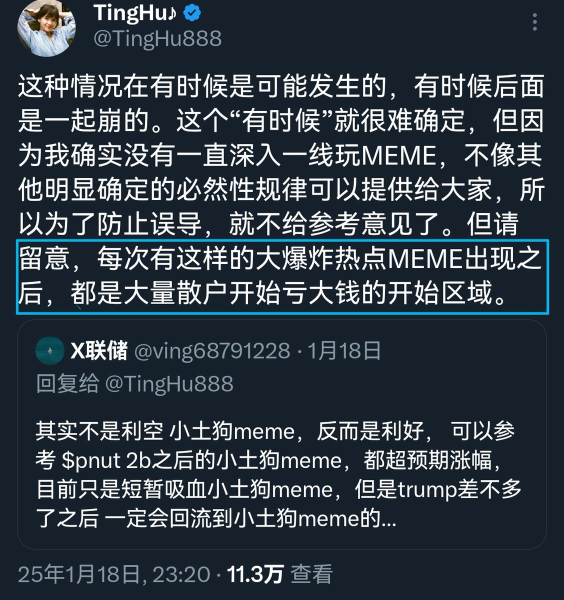 听不懂话外因也可能是经验不足或过于贪心。 曹操如果不知道吕布的历史,他可能就听不懂刘备在讲什么;如果过于贪心,想着万一自己魅力大,不至于重蹈董卓之覆辙,也可能收下吕布。 就比如特朗普币 $TRUMP 爆火的时候,有人认为利好行业。我请大家留意“每次有这样的大爆炸热点MEME出现之后,都是大量散户开始亏大钱的开始区域。” 那么,一些人是经验不足听不懂我讲的话呢?还是过于贪心,奢望美国总统特朗普能够带动币圈涨一波大的,从而选择不相信我的提醒,进而不做任何卖的操作呢?我想,都有可能吧~