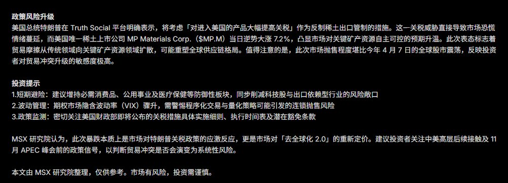 自 $Trump 开始我就非常讨厌川普这个人,他送给全世界的最大礼物,其实是认清现实。 在利益面前,所有主义都要靠边站。 周五晚川普宣布对中国加征100%关税,并对关键软件产品实施出口管制。 其实这件事有点巧合,我恶补了下资料 就在我国宣布对美国船舶收取停靠费用、并扩大稀土出口管控、同时传出对14nm以下芯片加强限制后。 可以看出,特朗普这次完全是被气到了。 消息出来后,美股直接崩盘。纳指暴跌3.56%,标普跌2.71%,道指跌近2%。 大型科技股惨不忍睹:AMD、高通跌超7%,英伟达跌近5%,市值一天蒸发1.6万亿,相当于一个中石油没了。 我认为,特朗普这次喊加征100%关税,更像是在做样子。 因为现在是中国主动在脱钩——不再买美国大豆,让澳洲矿用人民币结算铁矿石,中东石油也在推人民币计价。 美元体系在被一点点蚕食 在MSX研究院的最新报告里,团队从通胀链条、贸易结构、以及中美资产分化三个角度,拆解了这次加税背后的金融影响。 市场越乱,越需要逻辑。 MSX研究院的价值就在于——在情绪崩塌的地方,帮你看到结构。