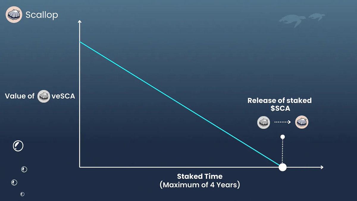 $SCA 持有者可以进入 Scallop 官方质押网站 ( https://t.co/PsKbJPRPOB ) 将 $SCA 质押锁定并获得 $veSCA 用户获得的 veSCA 数量与锁定的 SCA 数量与时间周期成正比。