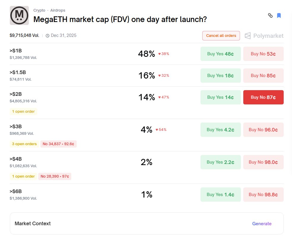 当前预测市场1B以上的NO多少还有部分空间、你问我为什么赔率这么奇怪、因为有一个天才一直在在买1b以上的YES订单、导致整体目前乃至3B都还有一个点的空间!