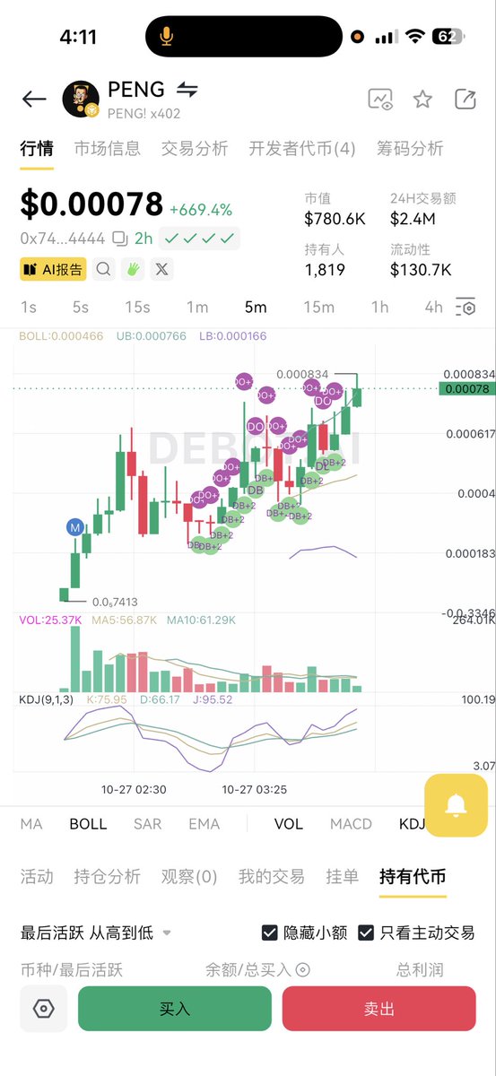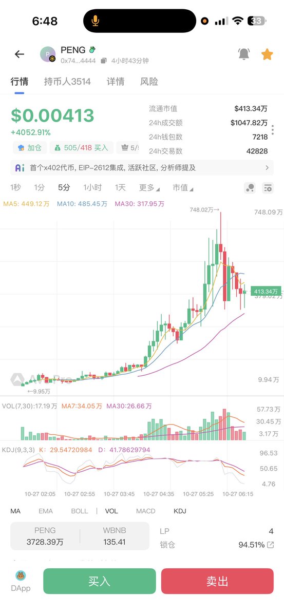 bsc @BNBCHAIN 上第一個 x402 協議代幣 $PENG ,熊貓@Cryptopanda1418 發群裡大概是 400k 左右,目前已翻倍,項目方設置了每三分鐘自動銷燬機制,感覺還是有點意思。