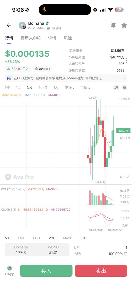 Sol @solana 官方改頭像,網友戲稱其為 $Bolnana ,本來已經睡了,群友在線掃鏈據說已經3~4倍,剛語音高潮直接把我給叫醒,被高位fomo進來接盤,我的持倉均價大概是140k左右,市場也沒什麼熱點玩,熬了一晚上也就這個可以玩一下了,兄弟們覺得有沒有角度?