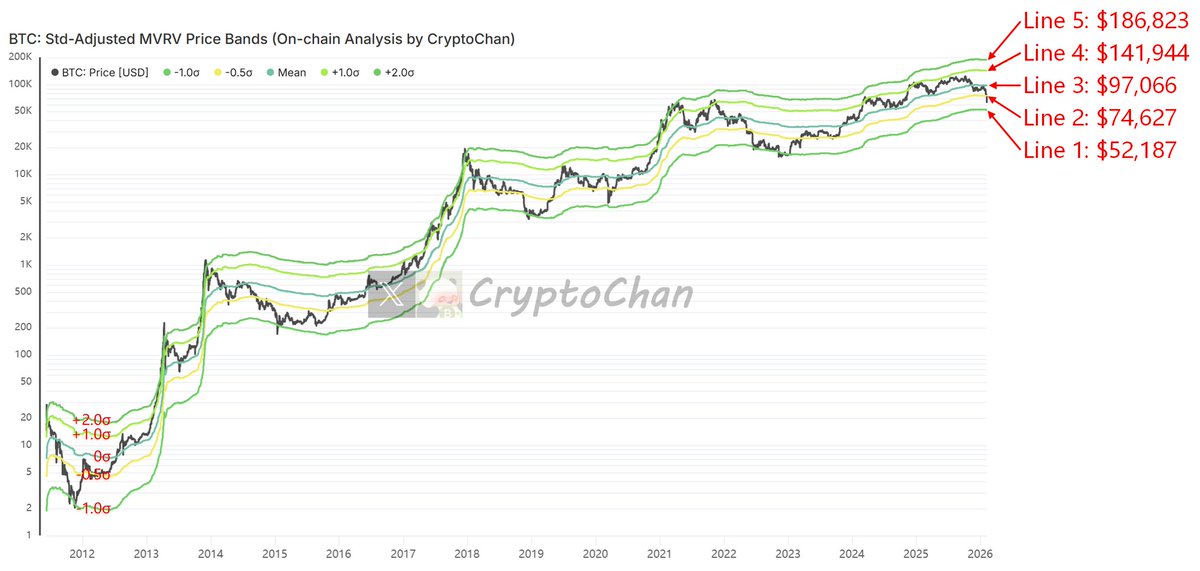 恰好手上有一个基于 #BTC: MVRV指标差开发的价格模型,该模型通过引入累积算术平均值与累积标准差,对MVRV进行统计学标准化处理,采用5条线将比特币历史价格完整囊括划分