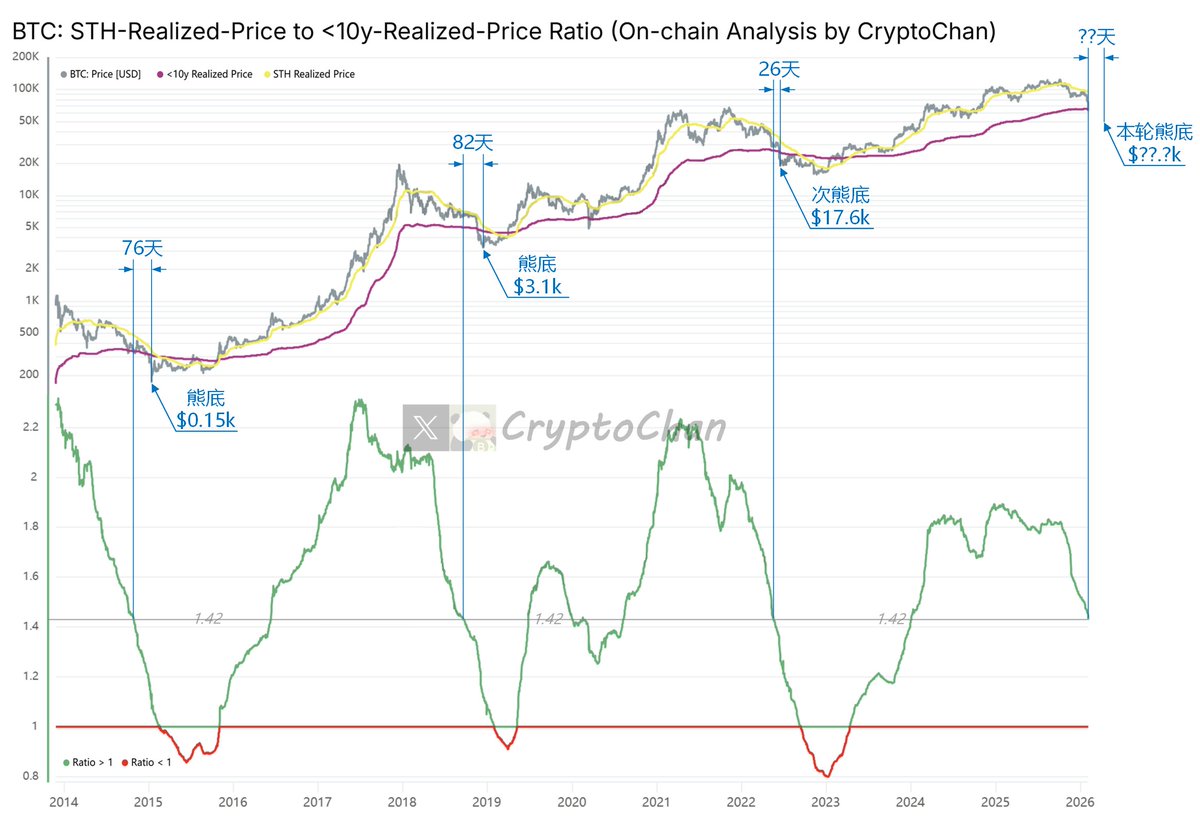 图中下方指标为“BTC 短期持有者成本均价”跟“BTC 长期持有者成本均价(剔除>10y筹码版)”之比(即:黄线 / 玫红线)