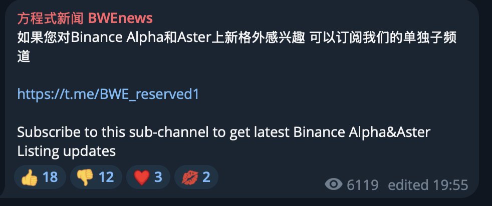 btw,方程式新闻也单独开放了一个频道,专门报道“上 Aster”以及币安 Alpha 和 moonshot。