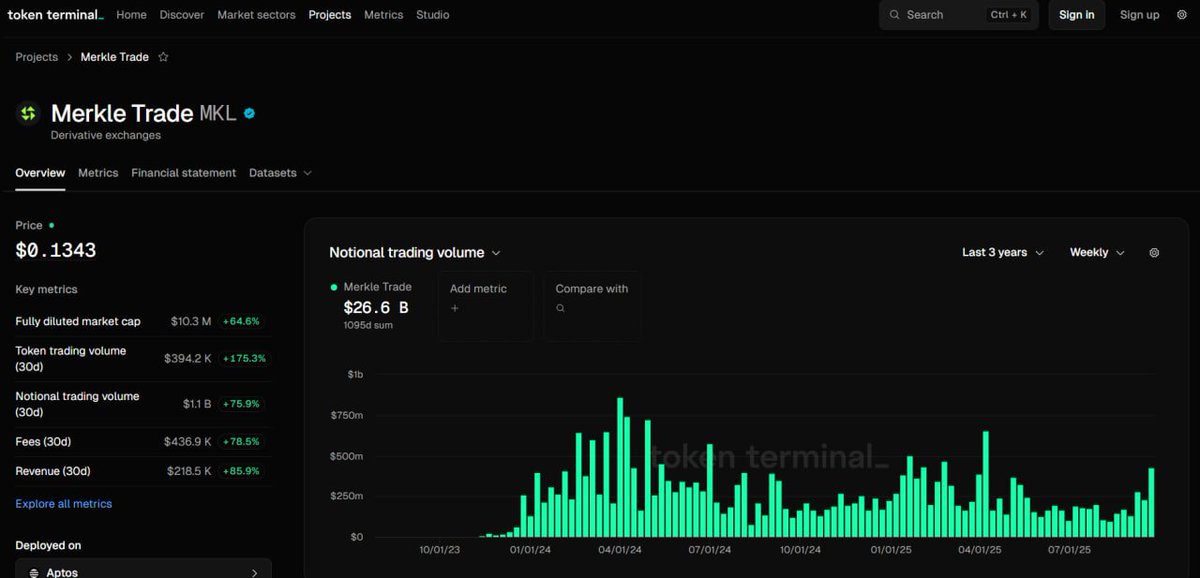 先从头讲起 @Merkle 最早是 2022 年 Aptos 黑客松冠军,当时还只是个 demo。两年过去,已经长成了头部 perp DEX ,累计交易量 $26B+,用户 16 万+,团队现在还在憋大招,移动端 app 马上要上线。背后投资人:Hashed、Arrington、Aptos Labs 都投了。