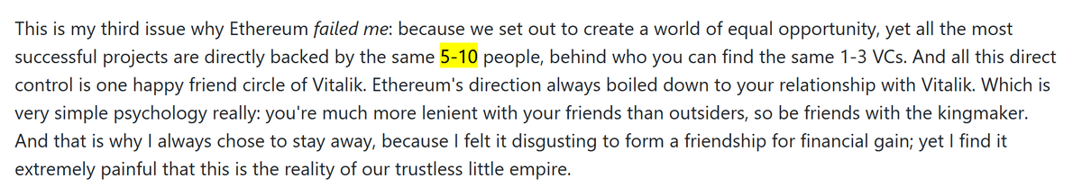 Peter 还说了一些令人沮丧的现状,包括“EF 内部有一个 5~10 位接近 V神的“以太坊思想领袖”构成的小圈子,只要请上几位研究员当顾问,项目方就能解决难题。”
