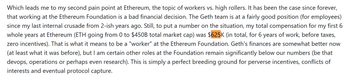 Geth (以太坊最大客户端的)的前负责人 Peter 自述,6 年了才赚 62.5w 美金工资,折合 1 年才 10w 美金多一点(还特么是税前)。