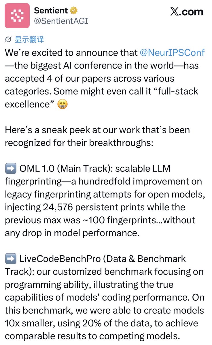 Sentient 算是为数不多真的在搞学术的 AI 项目,这次 NeurIPS 接收了他们 4 篇论文,这算是机器学习三大顶会之一,含金量还是相当高的。