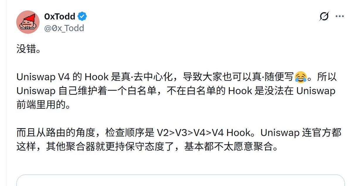 Uniswap V4 的 Hook 是真·去中心化,导致大家也可以真·随便写😂。所以 Uniswap 自己维护着一个白名单,不在白名单的 Hook 是没法在 Uniswap 前端里用的。