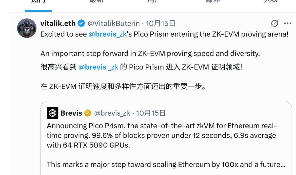 前几天 Brevis 因为刷新了 ZK 证明速度而被 V 神 cue 了,他们在 ZK 上的工作确实走得非常靠前。