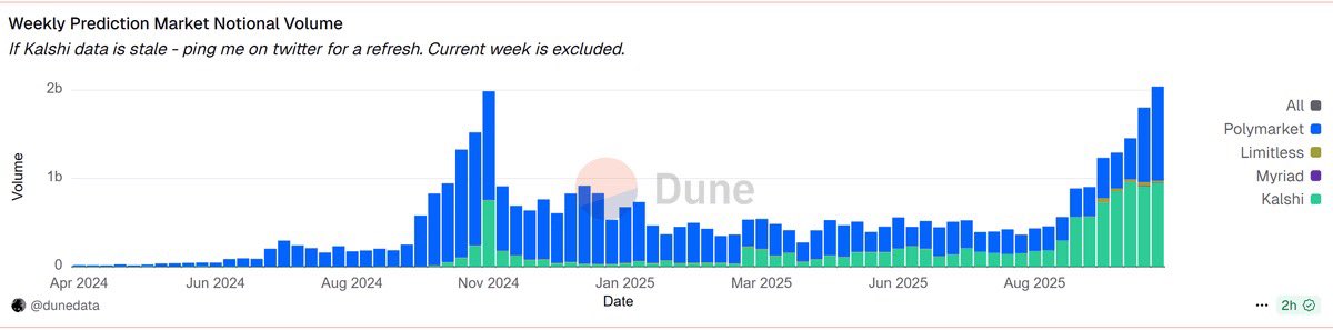 每周交易量最近突破 $2B,其中 Polymarket 占全部交易量的 52% 以上