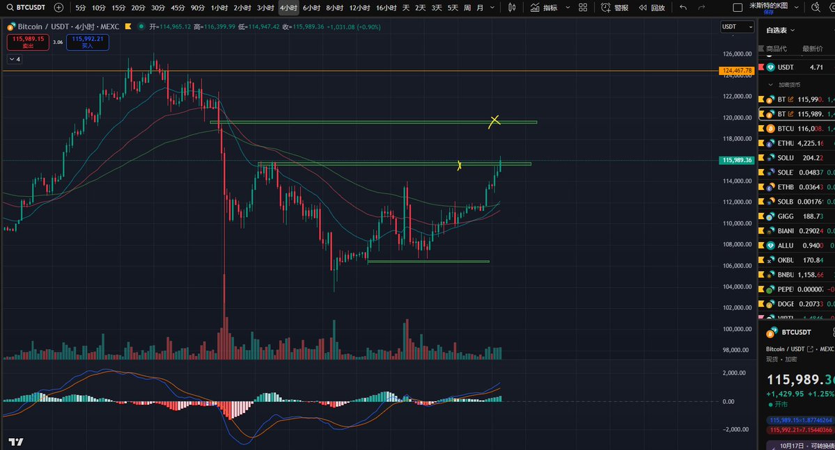 BTC连续两天冲那么猛,应该要回调下了,上方是新高位置,4H MACD高空也需要时间消化,期待接下来价格在118K附近震荡,走出盘整的形态,耐心等待机会入场。