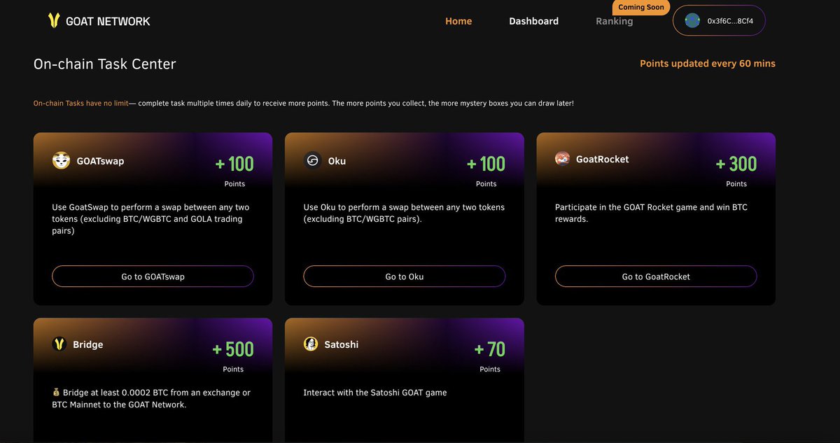 ▰ 基础任务:关注@GOATRollup +转发相关推文(1500分) ▰ 进阶操作:跨链0.0001BTC获500分