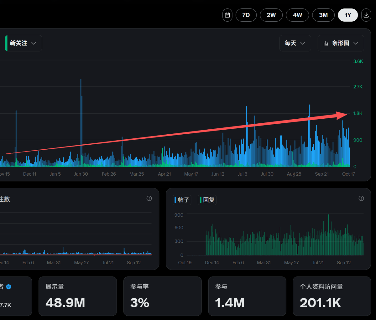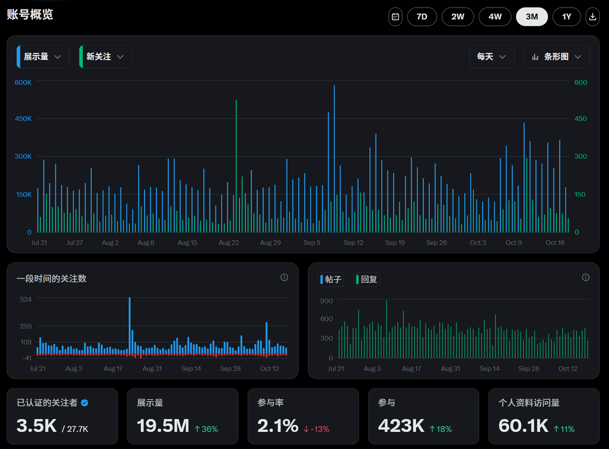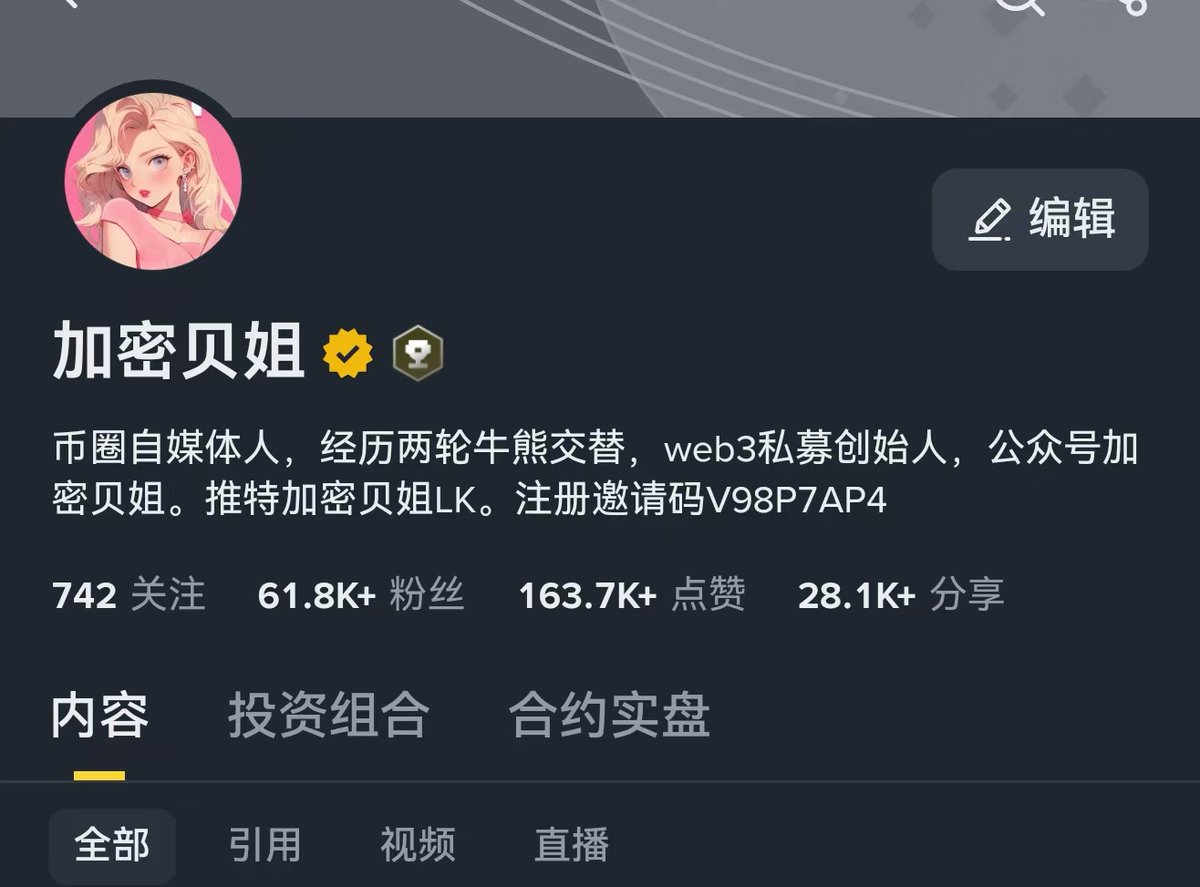1950万,要是贝姐的账户余额能像流量这样上涨就完美了,浏览量又迈上了一个新台阶!推特这三个月近2000万浏览量,加上币安广场和BG观点,一个季度保守估计得有3000万流量,平均一个月1000万。跟年初对比还是有很大的进步,4月份推特一个季度900万流量,现在翻了一倍。广场6.2万粉,推特2.8万粉,粉丝数也快十万啦,感谢宝子们的热情支持,贝姐更希望能带着大家赚钱,我是不是该再开一个高认知的VIP群跟志同道合的朋友一起投研成长!当然也欢迎金主爸爸们多合作送福利,大家记得点赞+关注喔!