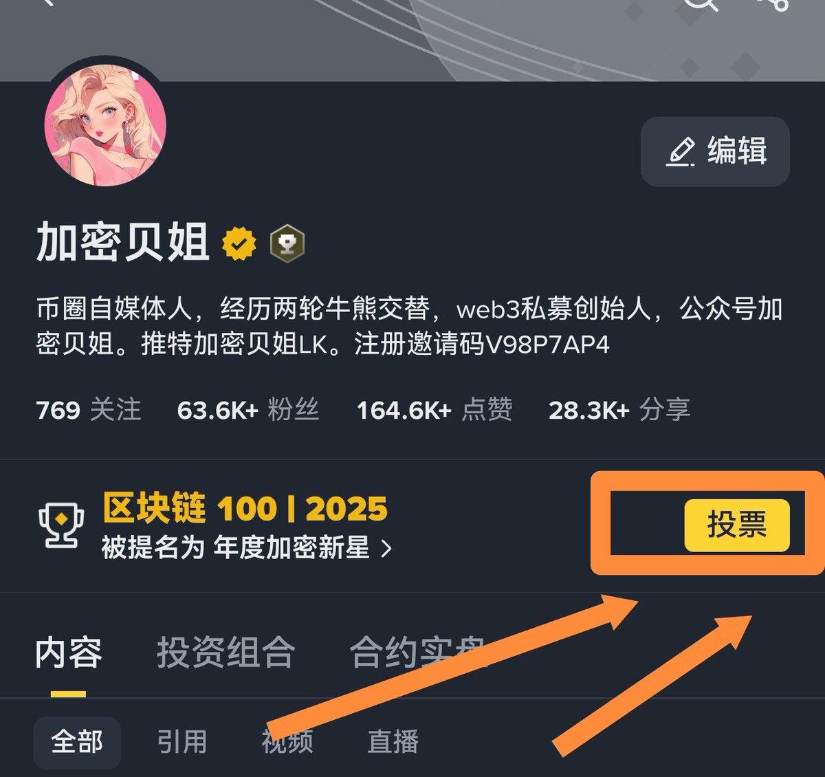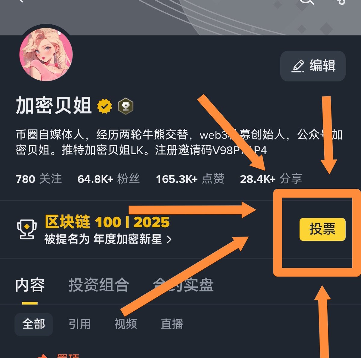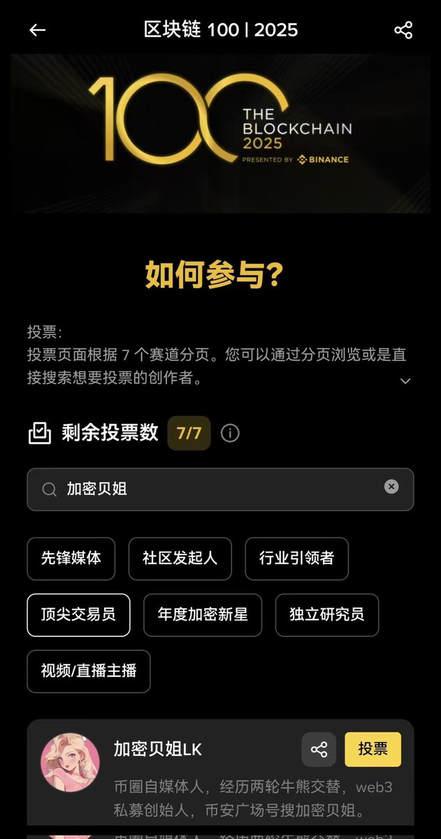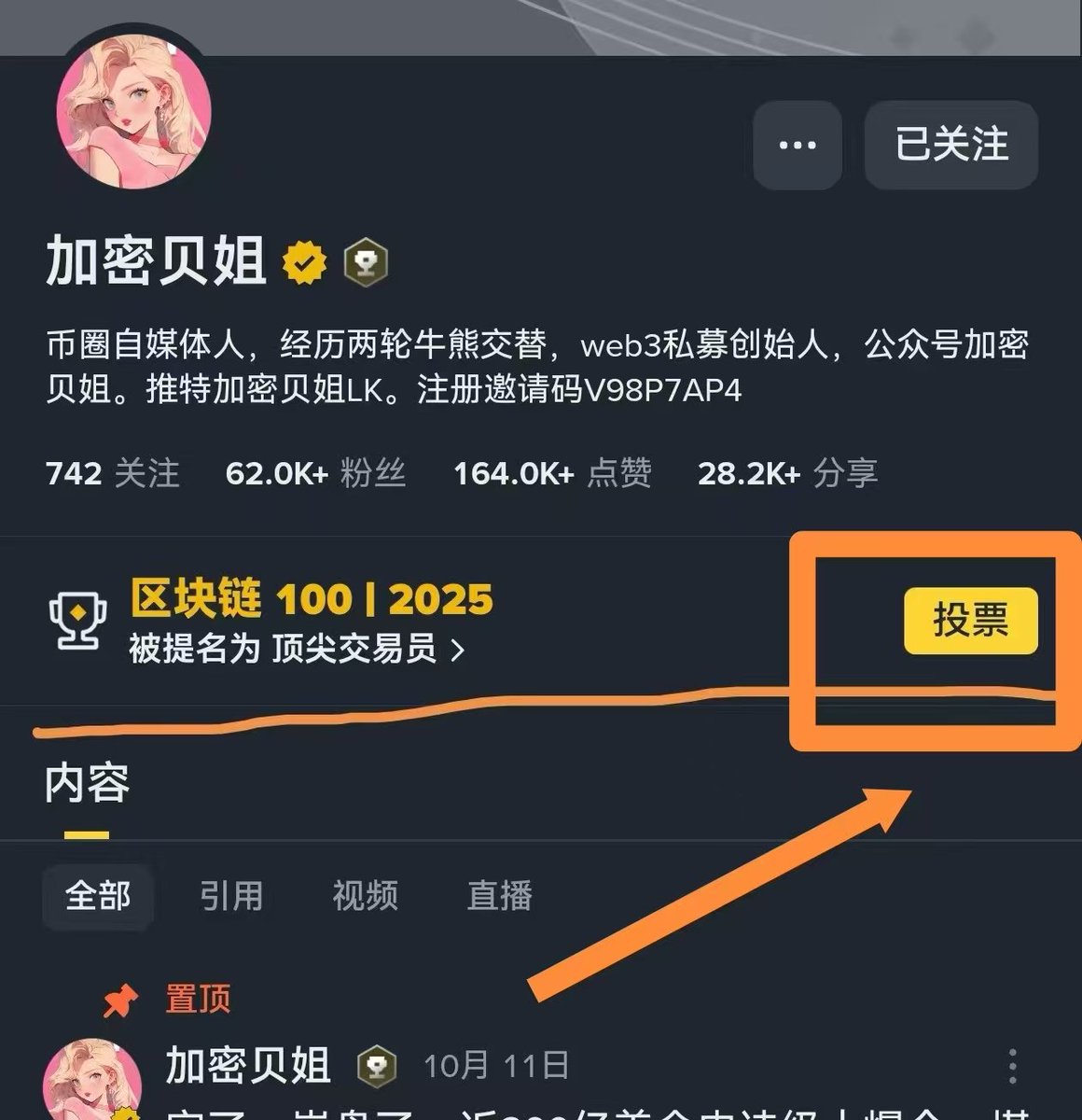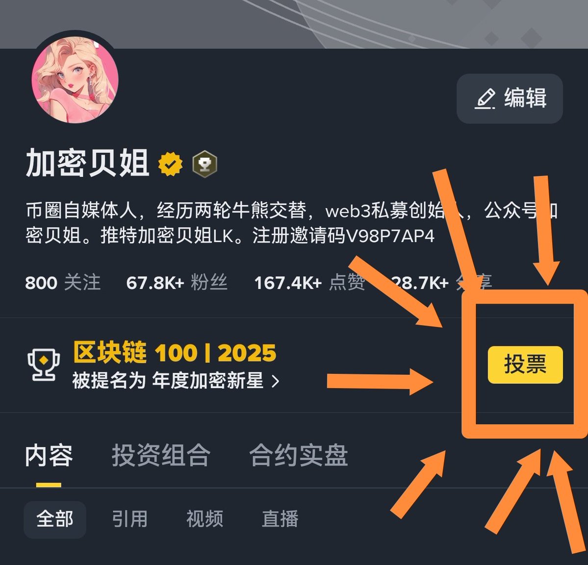 感谢宝子们的支持,很荣幸能得到币安的提名,币安全球区块链百强创作者评选活动开始投票啦!大家可以在币安广场搜索进入加密贝姐主页,点击右侧即可投票,非常简单用不了20秒。贝姐每天都会在广场主页发红包不要错过喔🧧,喜欢贝姐创作的请多多支持投票,每个赛道每天可以投一票喔,助力贝姐晋级,谢谢大家!贝姐今天开始也会在币安广场开启每日直播,聊聊投资,有兴趣的欢迎捧场!