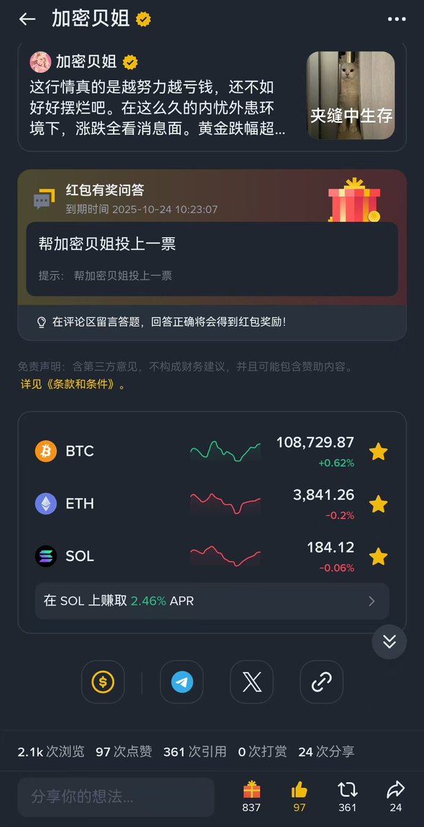 币安不仅打新卷,Alpha卷,连投票都超级卷,卷到国外大V Twin Tulips都在社区给贝姐拉票了,一场直播能推十几次也是真够兄弟了。这几天有好多粉丝每天都在给贝姐投票,真的让我很感动,感恩各位的用心支持和爱护,每一票都是鼓舞我向梦想前进的动力!创作者大赛全球投票倒数1天,国际友人都来卷投票了,你们还不行动起来?