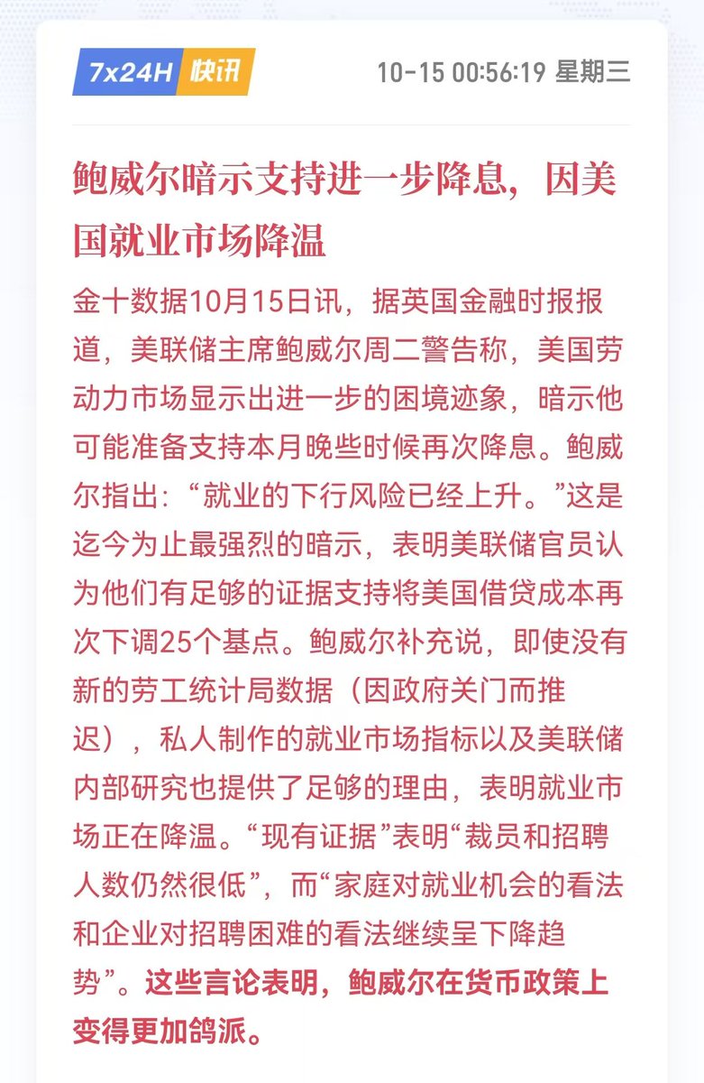 鲍威尔凌晨的讲话放鸽啦,大家可以放心了,他再次肯定了美联储可以继续降息,而且给出了或将结束缩表的预期,真是有点意外惊喜。当前市场最大的风险还是就业市场的风险,虽然大非农数据由于美国政府关门拿不到,但是各州的就业数据拿得到,现在的就业市场变化还是面临着下行风险。