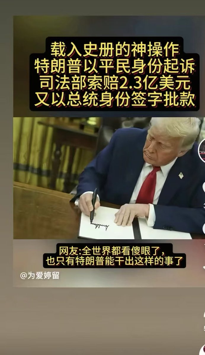 特朗普载入史册的神操作,他用平民身份起诉司法部索赔2.3亿美元,然后又用总统的身份签字批款。我估计全世界都要看傻眼了,也只有川普能干出这种左手换右手的事情了。