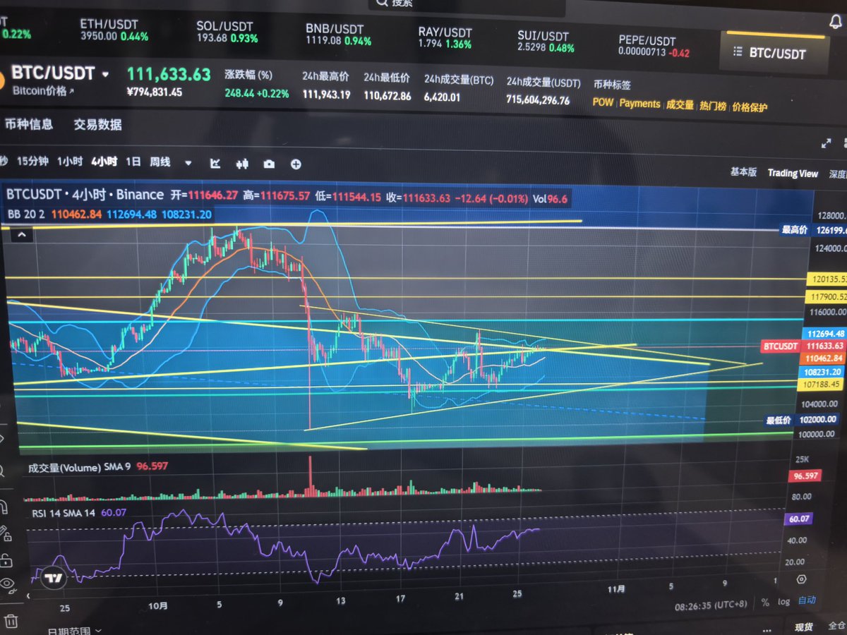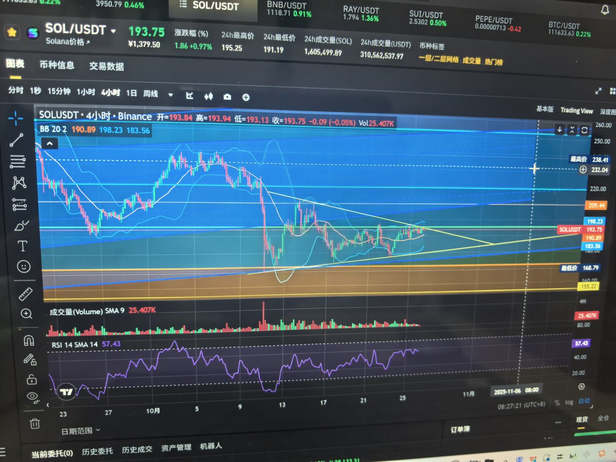 暴跌至今的行情很难玩,四大金刚一直都在三角收敛区间震荡,从区间推断,到变盘选择方向至少要到下周,这也是震荡筑底的阶段,这个过程不好判断,也是考验你的时候,不过至少本周没有爆出机构暴雷的事件,跌不下去也算好事。现货分批加仓sol和bnb是目前风险收益比相对高的策略,继续持有和买入!至于其他山寨币还不是进场的时候,等大方向出来再说吧。