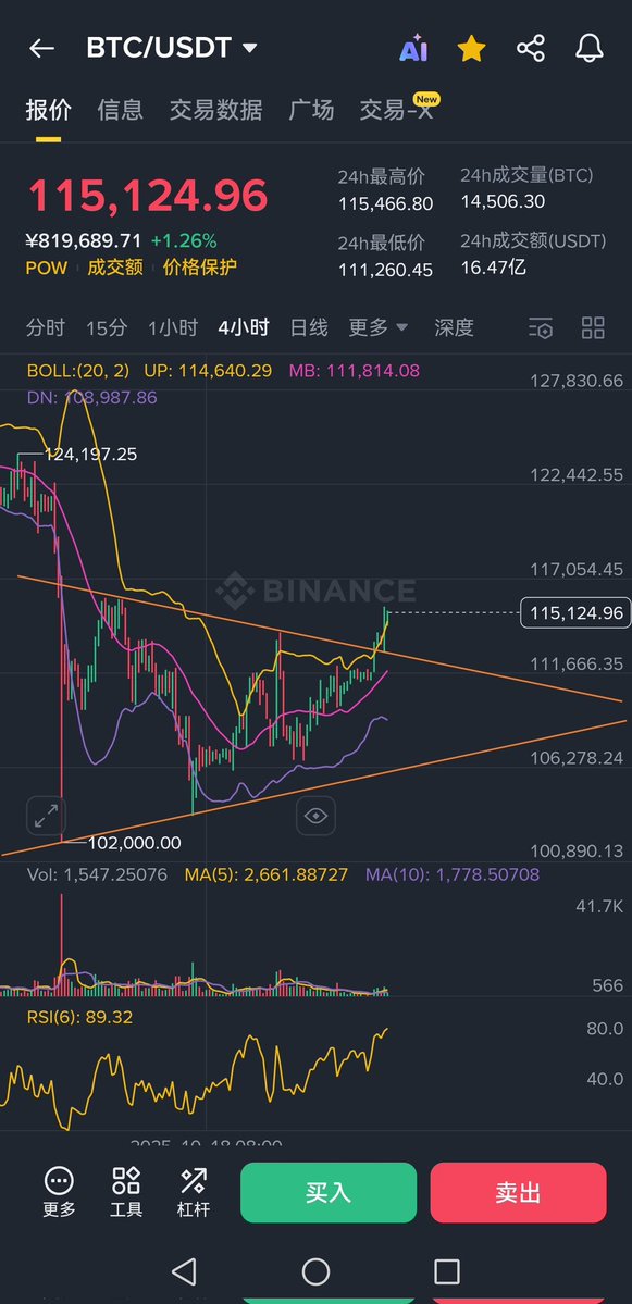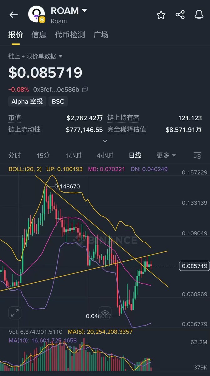 ROAM现在已经突破了下降趋势线,正在完成回踩确认,接下来重点观察是否能站稳原上升通道之上,并突破短期强压位0.1,如果可以则结构会形成反转趋势。大饼现在也突破了11万6的反弹前高,短期看涨利好山寨。