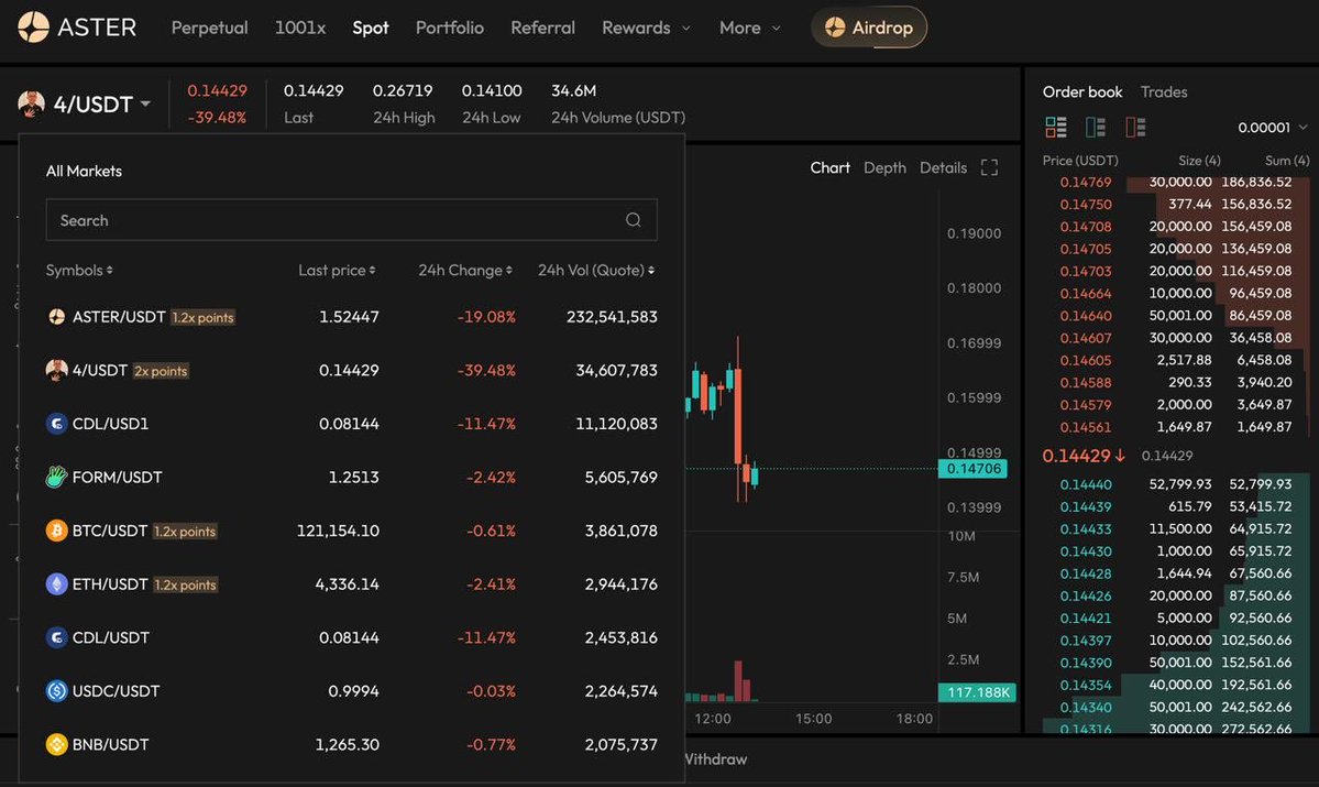 过去 24 小时里,$4 在 @Aster_DEX 的现货交易量达到 4400 万美金,仅次于 $ASTER ;成为全平台第二热的交易对。