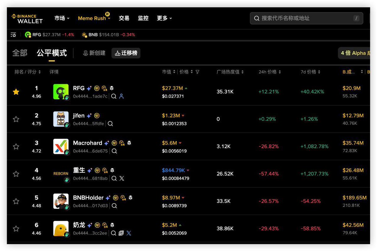 盘面上看,目前市值27M,地址分散,k线波动不大。有上币安Alpha潜力吗?看最近哈基米(市值50M)和修仙(20M)快速上Alpha,它们社区强、共识热。$RFG 社区驱动、无团队预留、开放预测市场工具给Binance生态,短期炒作空间大,如果AI落地好,有望跟进上Alpha,甚至现货。