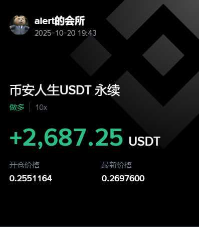 0.258做多 $币安人生,最高盈利5000刀没走,目前盈利2600没破开盘价又加了点。预期如下: