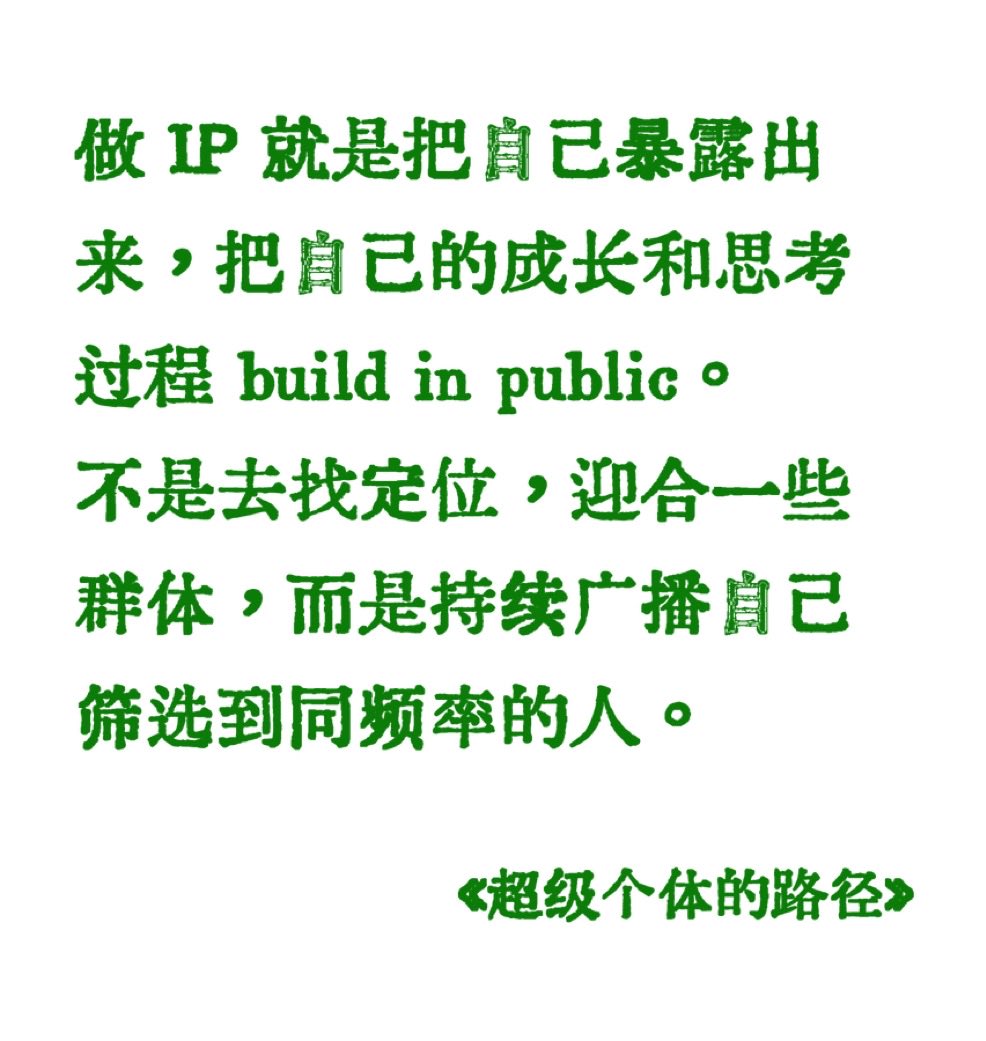 做IP 就是把自己暴露出来,把自己的成长和思考过程 build in public!不是去找定位,迎合一些群体,而是持续广播自己筛选到同频率的人🤔 实践过感觉是这个道理,很久以前分享过再分享一次 。。 https://t.co/X1xfE1V5SD