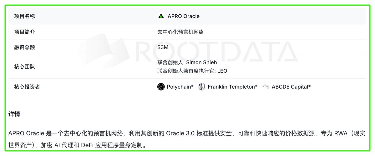 首先让我注意到的是它的融资情况:作为一个已经运营一年多的成熟项目,APRO 只公开过 300 万美元的种子轮融资,由 Polychain 和 Franklin Templeton 领投,而且到现在还没发币。