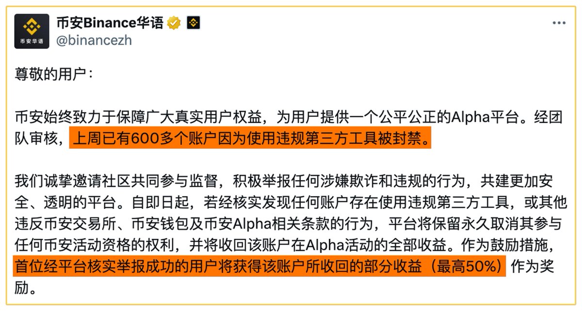 另外,最近币安在封禁刷 Alpha 的账户,或许顺带参与其他模块,也是保持账号活跃、避免被封的一种方式。