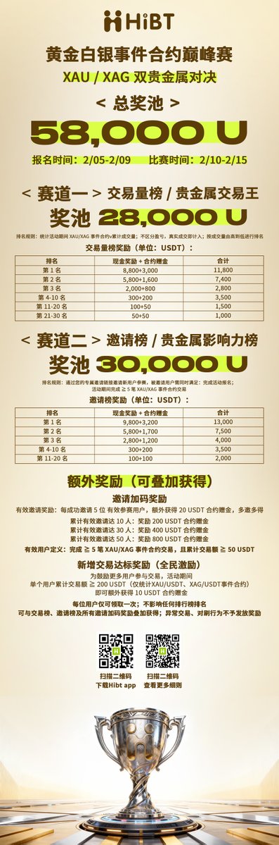 😍@HIBTGlobal 黄金白银对决直接58000U奖池摆上桌,纯纯的福利自助餐,手快有手慢无🔥