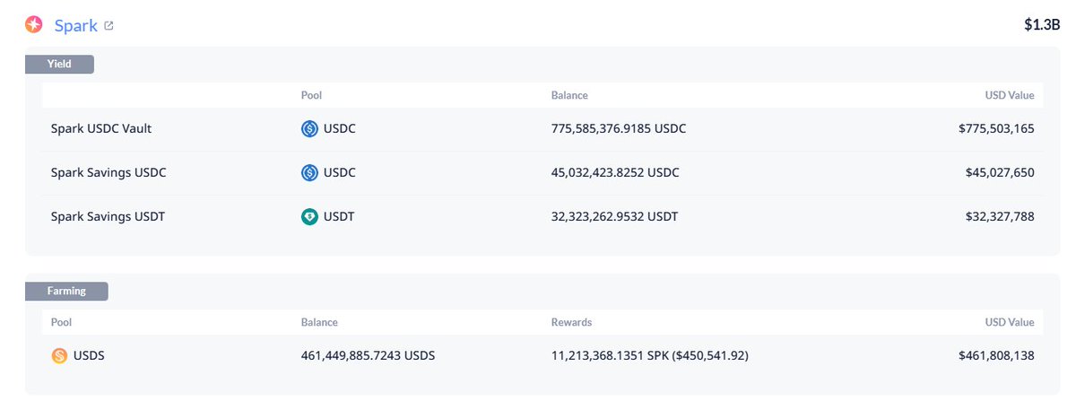 根据公开地址数据,孙哥挪了一部分Aave的仓位,在 @sparkdotfi 里面放了13亿美元的资金做理财:
