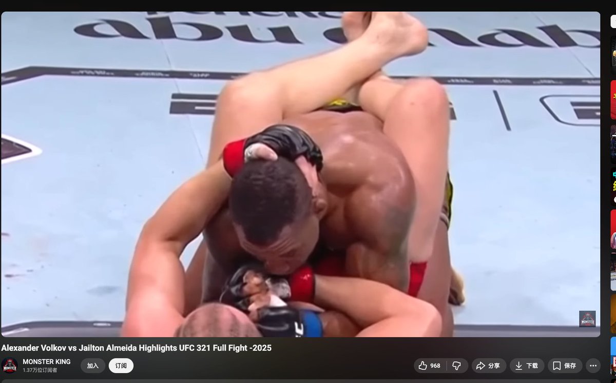 看到AB的这条推后出于亲自验证真实性的习惯去油管看了Volkov vs Almeida 这场比赛的录像,UFC321 。