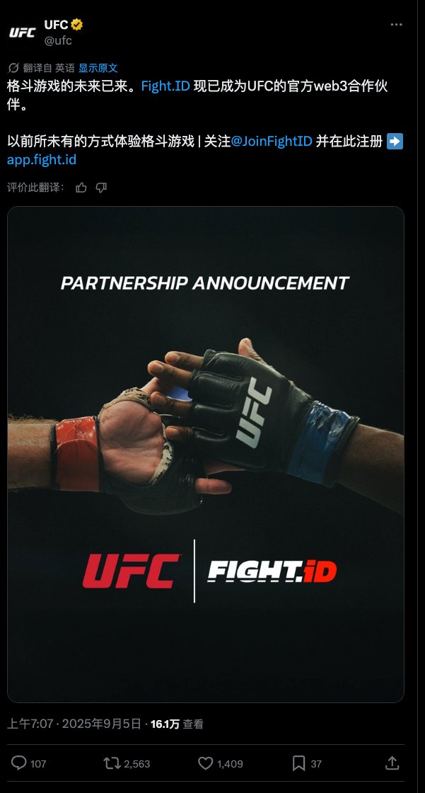 没想到 9月的时候UFC官推的确宣布过FightID是官方Web3合作伙伴,现在还能看到。