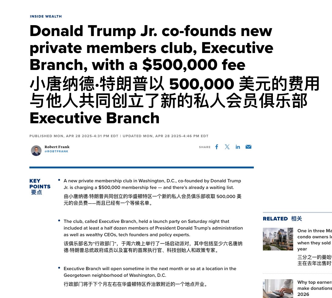 去搜了一下微信群消息里的CNBC链接,发现这个文章主要说的是Trump大儿子Jr. 和 WLFI 的团队核心作为合伙人一起开了一个叫“行政部门”的俱乐部(收费群),更牛逼的是其它创始人还包括: