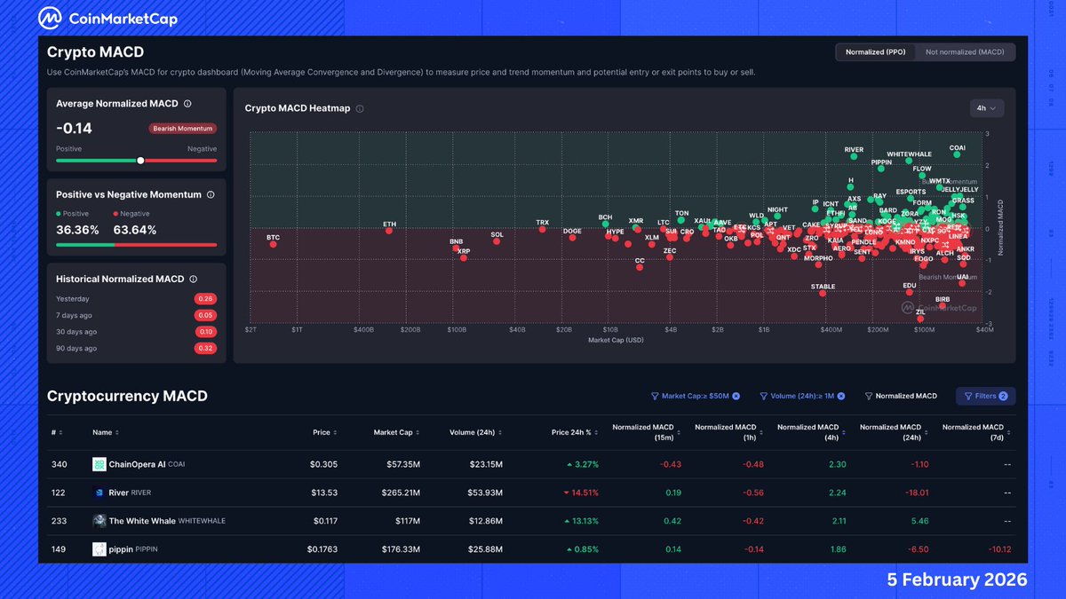 💡CoinMarketCap |加密货币 MACD 仪表板 💡 交易 101:RSI 告诉您价格何时被拉长 → MACD 告诉您趋势的强度。 在激烈的市场中,价格走势往往具有误导性。聪明的交易者使用 MACD 来发现看涨背离。 (当价格跌至较低水平时
